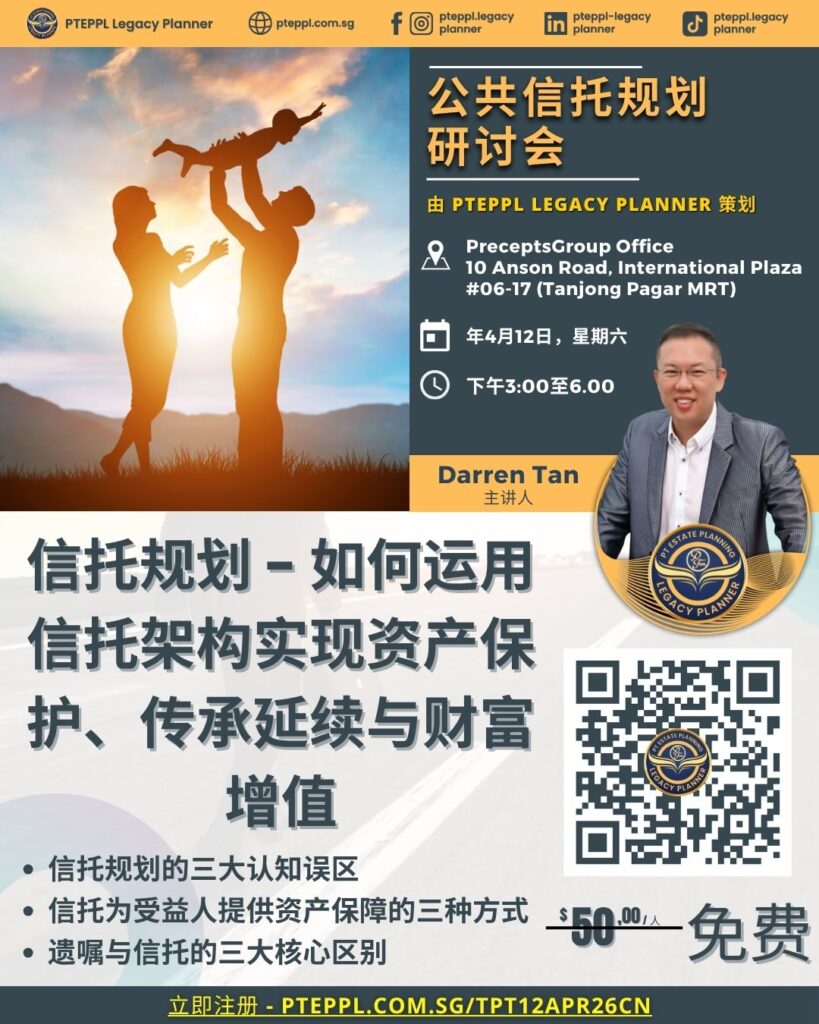 欢迎与经验丰富的遗产规划师 Darren Tan 一起参加一场内容丰富的研讨会,了解如何有效地进行遗产规划。本次研讨会将探讨信托规划如何保障家族资产、保障家族未来,并解决复杂的资产分配问题。无论您是想将资产传承给挚爱亲朋,还是为子孙后代留下一份持久的遗产,本次研讨会都能为您提供必要的知识,助您做出明智的决策。由于座位有限,请立即预订——免费参加!(若您是财务顾问,则费用为 50 新元)。具体地点将很快公布。让我们积极规划,共创安全的未来。